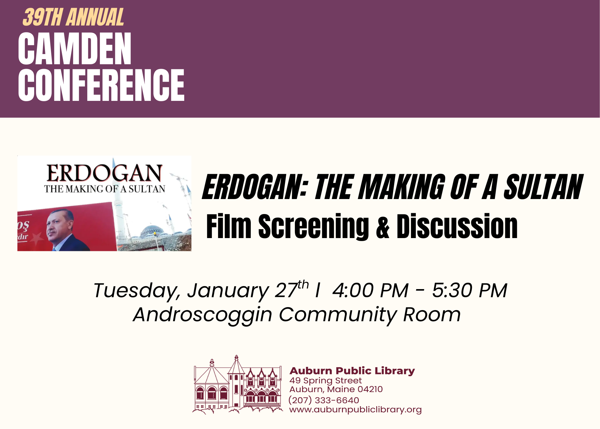 The Camden Conference and the Auburn Public Library invite you to a film screening and discussion of "Erdogan: The Making of a Sultan."
